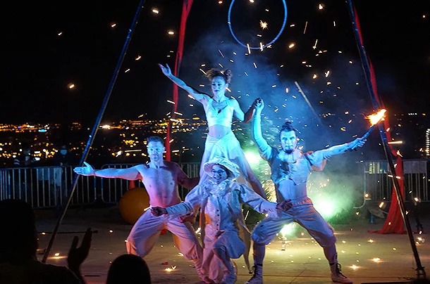 Espectáculo en clave de clown, con acrobacias, malabares y números aéreos (Trapecio, telas o aro).